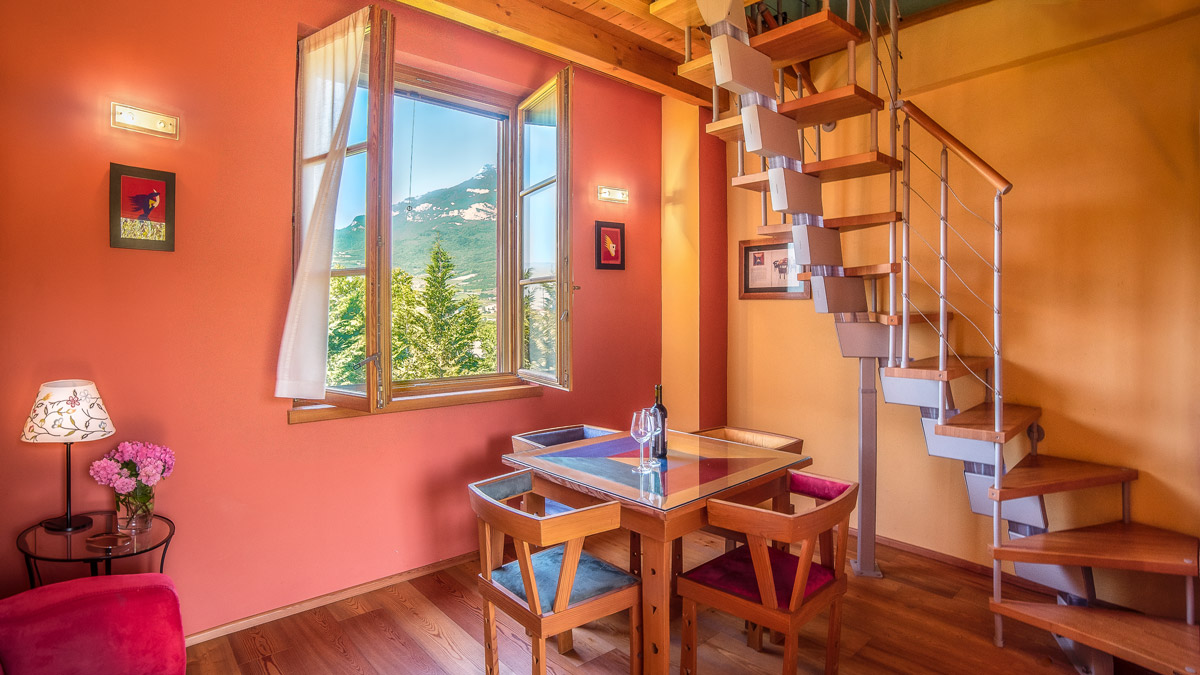 The suite is characterized by its cheerful and modern furniture and its bright and colourful rooms. Stunning views from the Alps and our garden. Suitable for up to 3 persons with a double bedroom or twin beds with the possibility of an extra bed. Private bathroom with shower.